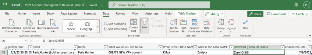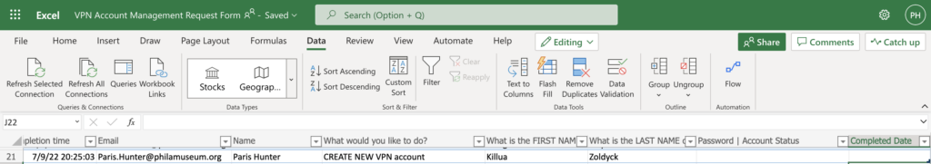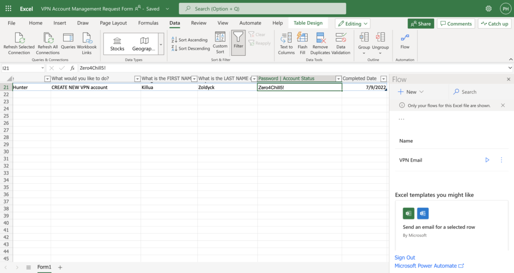 Enter Microsoft Flow (under Microsoft Automate) where I created an automation which emails that account status and password to the requestor with the click of one button directly from the spreadsheet on Excel Online. By simply highlighting the Password | Account Status cell, then clicking DATA on the Excel menu bar and clicking FLOW, my VPN Email option will appears.
