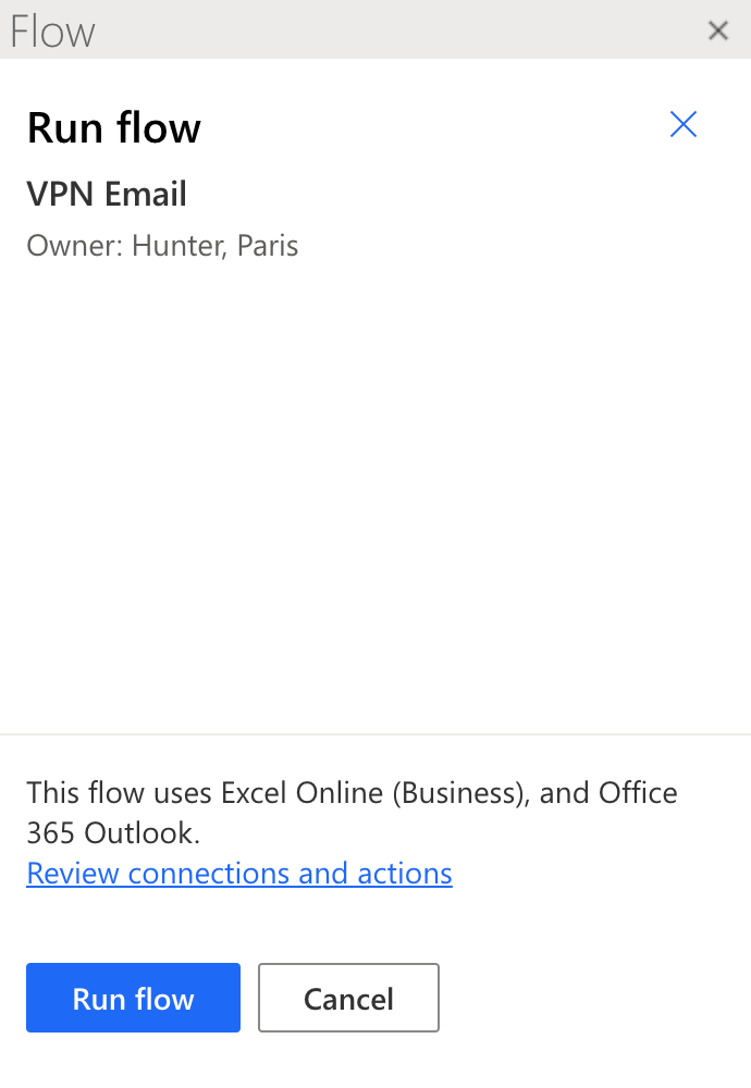 The next screen confirms what the flow will be accessing (Excel Online and Office 365 Outlook in this case)