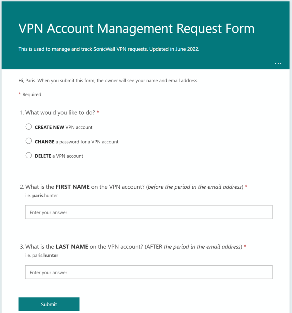 Returning to an old standby, I created another Microsoft Form, this time with only 3 simple questions with the understanding that only those in the IT department will be filling out this form so it can be short and sweet. Currently, there are NO plans to share the VPN passwords with end users so it helps to have a central place for requests AND a central place to confirm previous passwords and/or VPN account status.