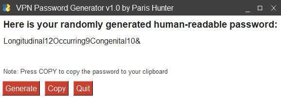 Previously, I was creating the VPN passwords by hand using a system where I decided to take whatever was on my mind and then turn it into a password by counting the letters and adding the number after the word and then slapping on a exclamation point.
