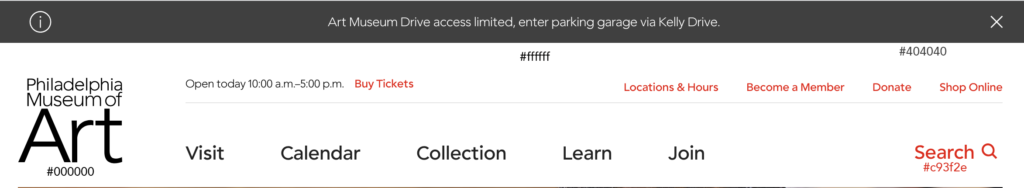 - A color scheme that matches the design of the Philadelphia Museum of Art's website. I even used the closest font I could find to match the layout.